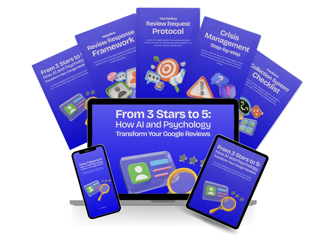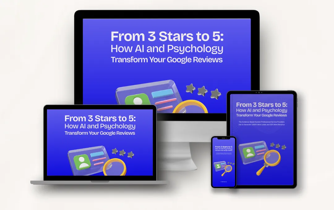 From 3 Stars to 5 The evidence-based system covering perception psychology, Google's dominance, satisfaction triggers, experience design, the art of asking, negative review handling, and your 90-day implementation roadmap.